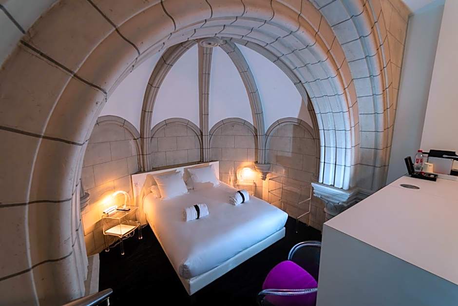 These rooms are located either in the apses, to either side of the nave of the vaulted chapel (now the lobby), or in a suspended room with views over the lobby's stained-glass windows, visible from the bed.